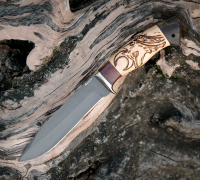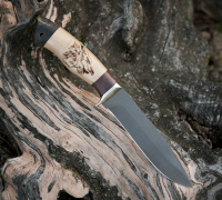 Нож Олимп из булатной стали, рукоять - стабилизированная карельская береза, кожаный чехол идет в комплекте.