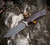 Нож Зевс из булатной стали, рукоять - стабилизированная карельская береза, кожаный чехол идет в комплекте.