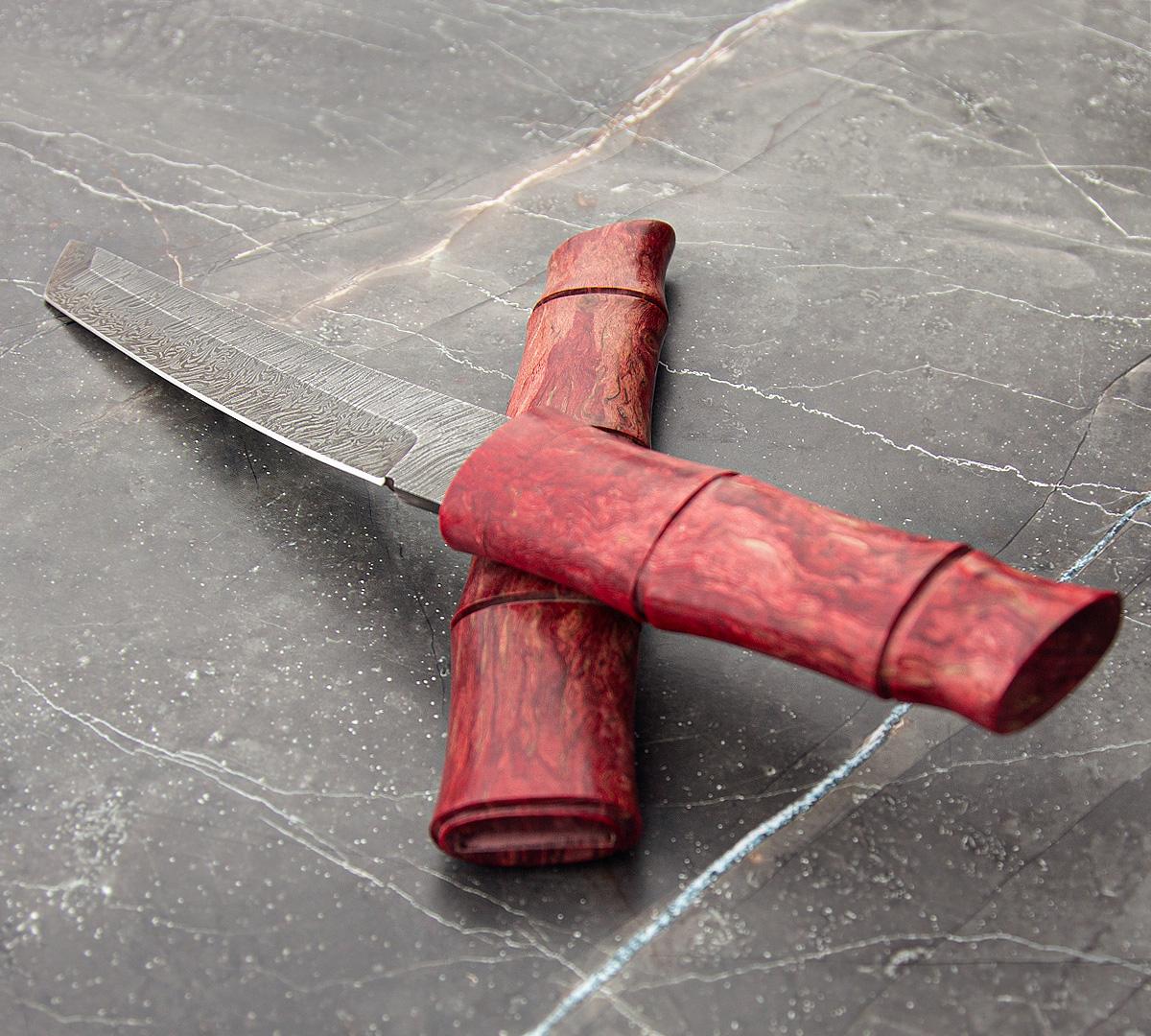 Нож Танто из дамасской стали в деревянных ножнах, рукоять и ножны - стабилизированная карельская береза.