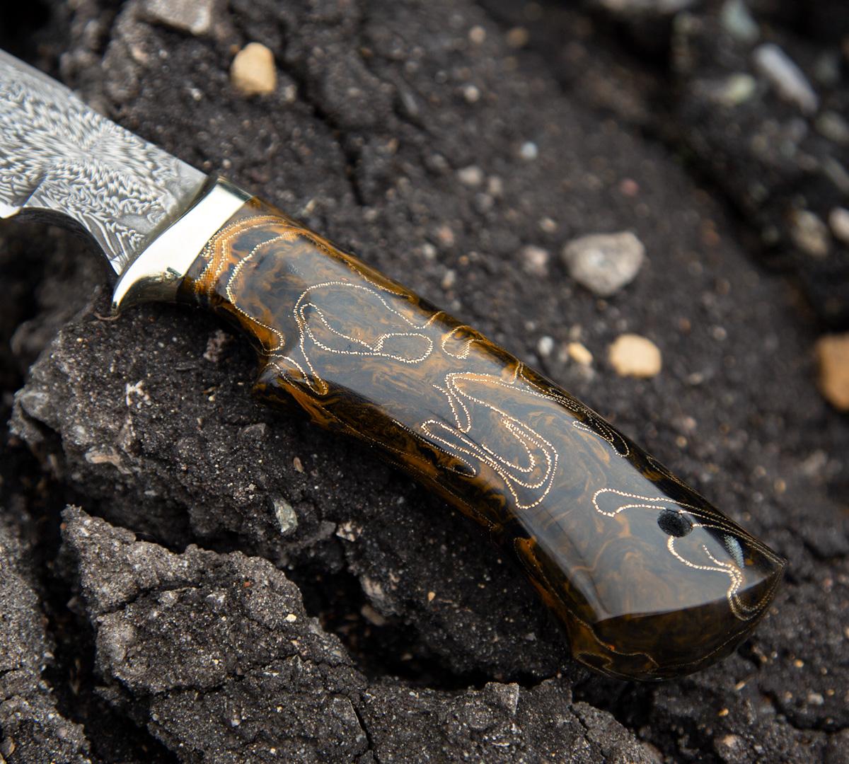 Нож Гефест из мозаичной дамасской стали, рукоять - Акрил. Кожанный чехол идет в комплекте.