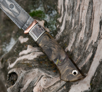 Нож Ладья из мозаичной дамасской стали, рукоять - акрил, стабилизированный зуб мамонта. Формованный чехол идет в комплекте.