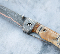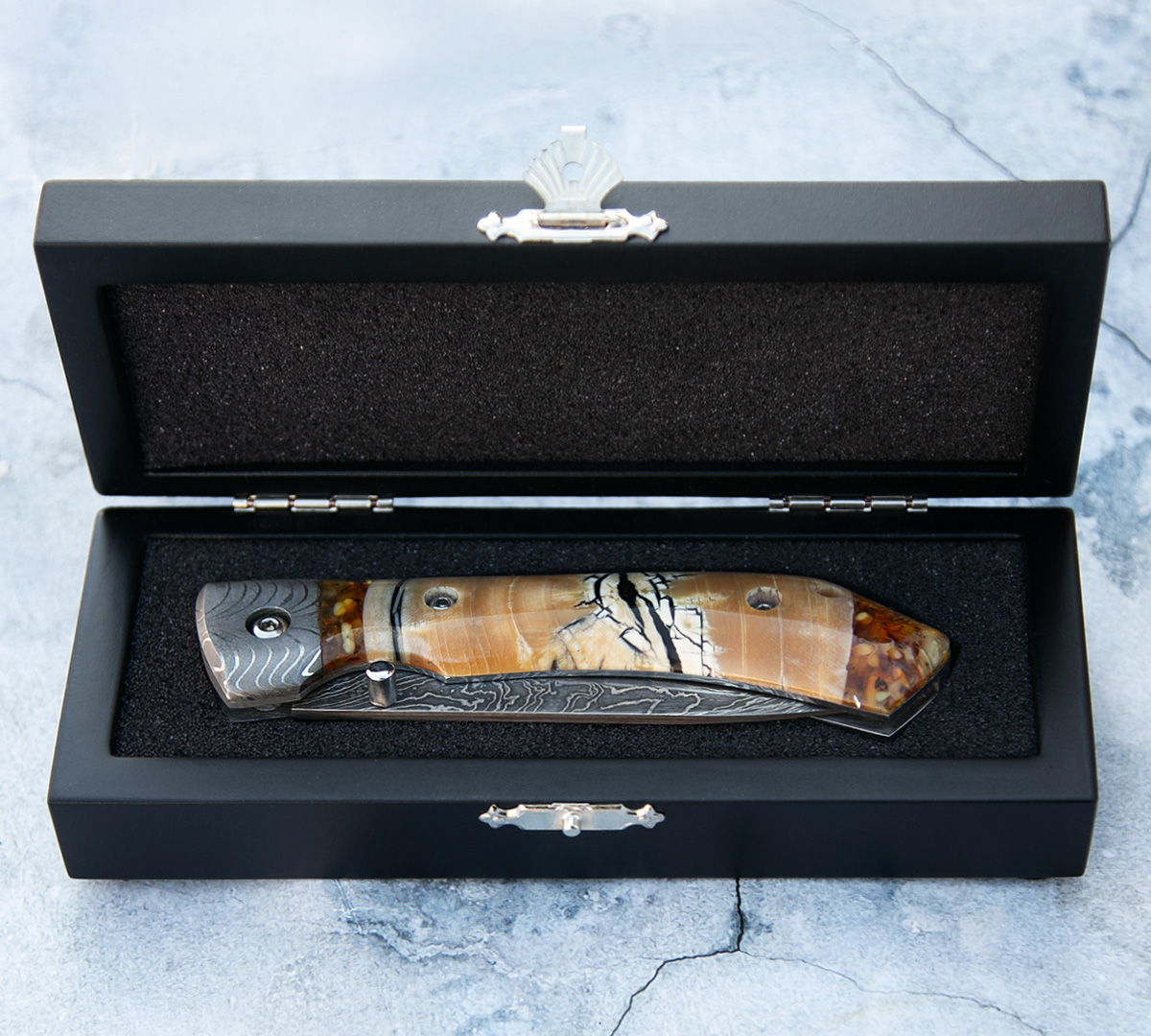 Нож Складной №3 из ламинированной стали , рукоять - стабилизированный бивень мамонта. Пенал для ножа идет в комплекте.